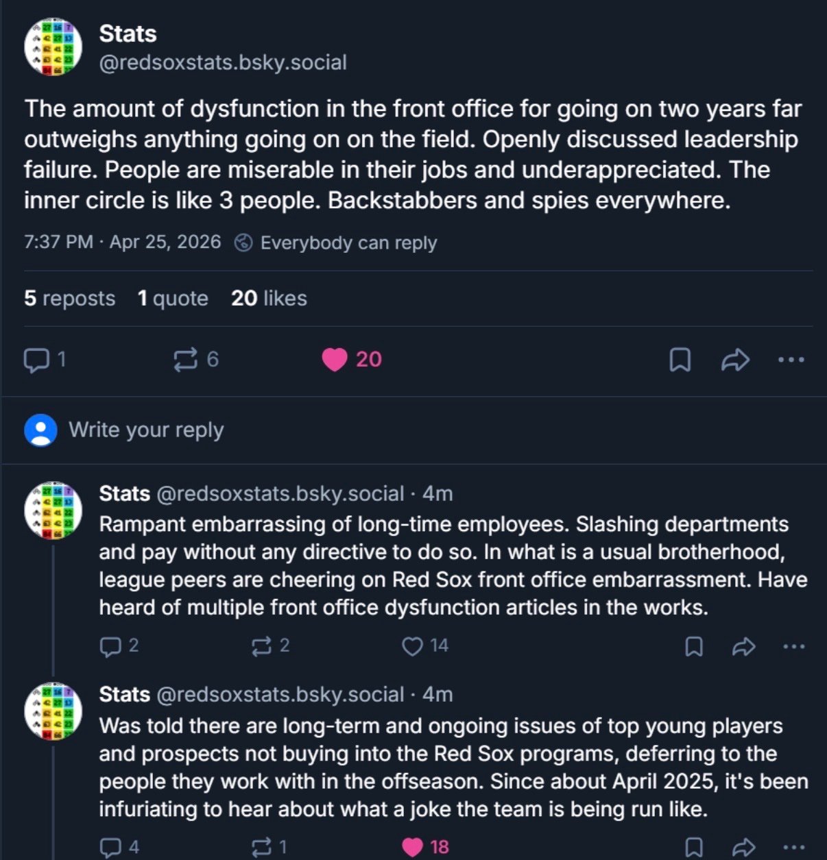 I don't know what to make of this mess and who to blame. I only know that once again my team is embarrassing, after a lifetime of watching mostly winning Red Sox teams with respected organizations.