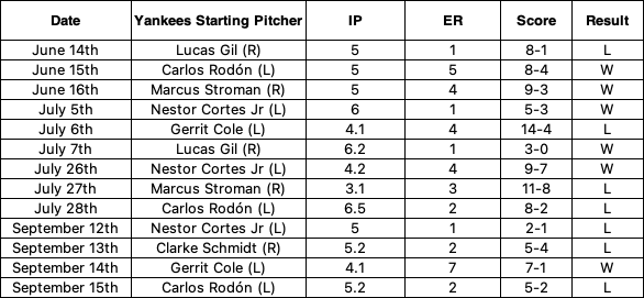 Thank you for your kind words! 😊 I’m glad you enjoyed the piece. I appreciate your support and look forward to sharing more articles in the future! Aside from beating up on Cole, I think it boils down to post All-Star break fatigue with the offense dying and the bullpen's inability to hold a lead. Before the All-Star break, the team held a 4-2 record against the Yankees. Afterwards? Their record is 2-5. The Sox have certainly shown that they *can* get to the Yankees pitching staff. They scored at least 5 runs in 5/6 of their wins against the Yankees. It’s interesting to see that the Sox and Yankees splits are flipped for RS/RA and W/L. -